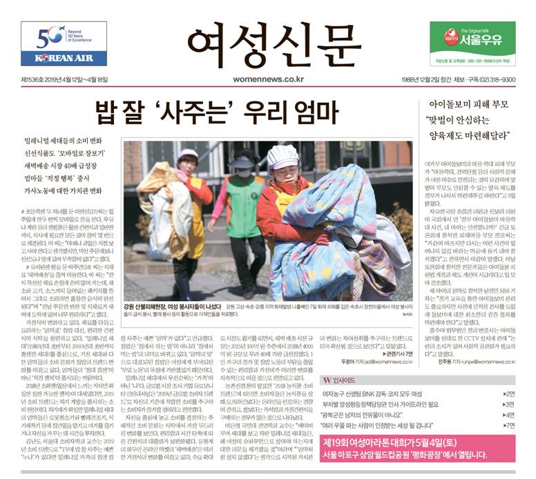 - 여성신문 1536호 ☞1면 톱기사 밥 잘 '사주는' 우리 엄마 가정식이 변화하고 있다. 재료를 다듬고 요리하는 '엄마표' 집밥 대신, 편리한 간편식이 식탁을 점령하고 있다. http://www.womennews.co.kr/