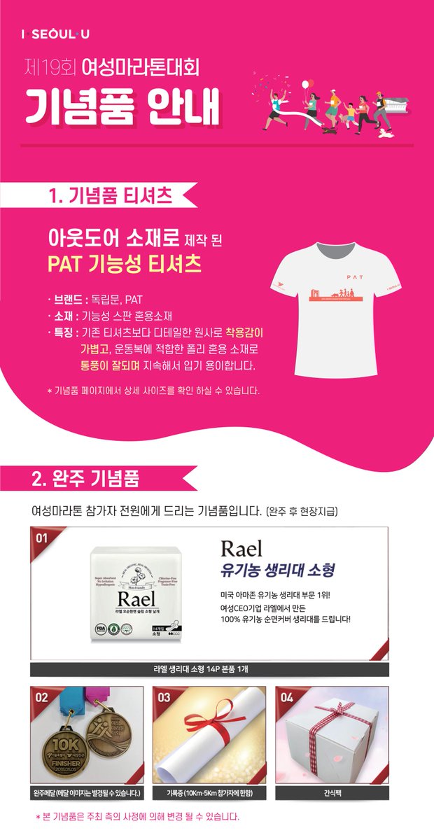 - 제19회 여성마라톤 대회 손잡고 RUN, 다 함께 HAPPY! 대회일시: 2019년 5월 4일(토) 08시30분 집결 대회장소: 서울 상암동 월드컵공원 평화광장 참가대상: 남녀노소 누구나 참가부문: 마라톤코스(10km, 5km), 걷기코스(4.5km) 참가신청: http://www.womenmarathon.co.kr (~4월 14일까지 접수 중)