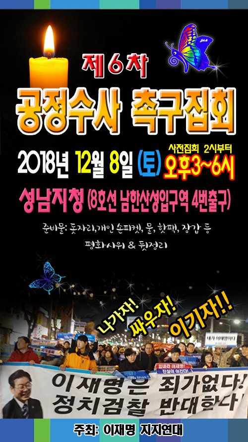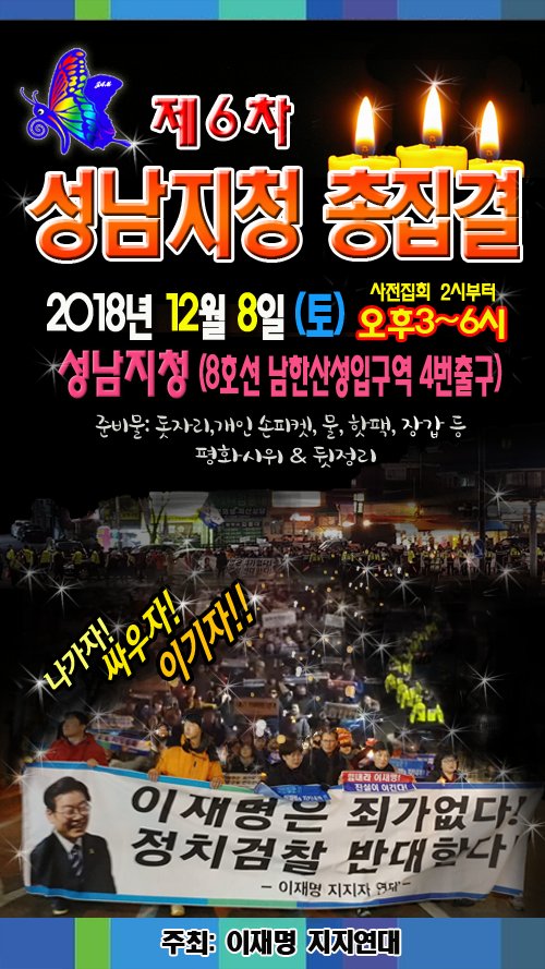 - Agora대한민국 retwitteó★2018.12.8~22매주 토요일 19시 광화문 촛불집회 공지★ 취지 : 이재명 구명 운동 촛불 행진 및 집회 장소 : 현대해상본관 앞 준비물 : 촛불(LED/양초)물 집회신고 완료 광화문->보신각->광화문: 행진+홍보물배포 네이버카페: 1910년이재명 주최:수십만 이재명들 유투브: Korean First TV https://twitter.com/piafindit/status/1070527325190541312 …Este Tweet no está disponible.